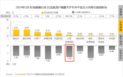去年,红果短剧App上线,主打免费,以小说IP改编和热门付费剧二轮授权快速吸引用户。其优势在于储备海量IP,参与短剧制作并以收入分成方式出售版权,提供现金投资和签约编剧帮助改编。免费短剧具有快速扩充泛用户人群的优势,红果短剧今年3月移动视频App使用时长增量居第三,平均月人均单日使用时长达1.38小时。