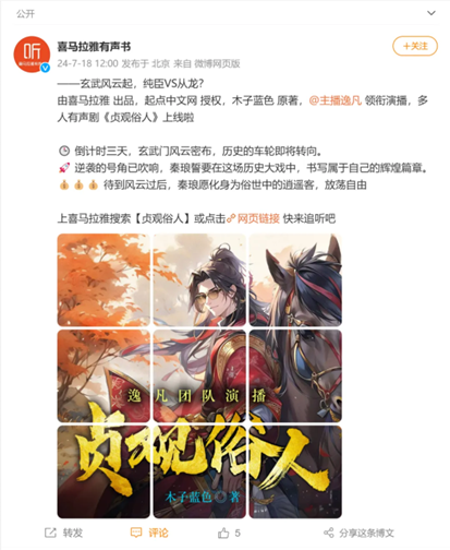 声音的力量不仅能穿越时空,还能将所有创作者紧密联结,共创“声音宇宙”。作为声音内容的基石,创作者们在喜马拉雅集结,共同迎接“耳朵经济”时代的来临。
