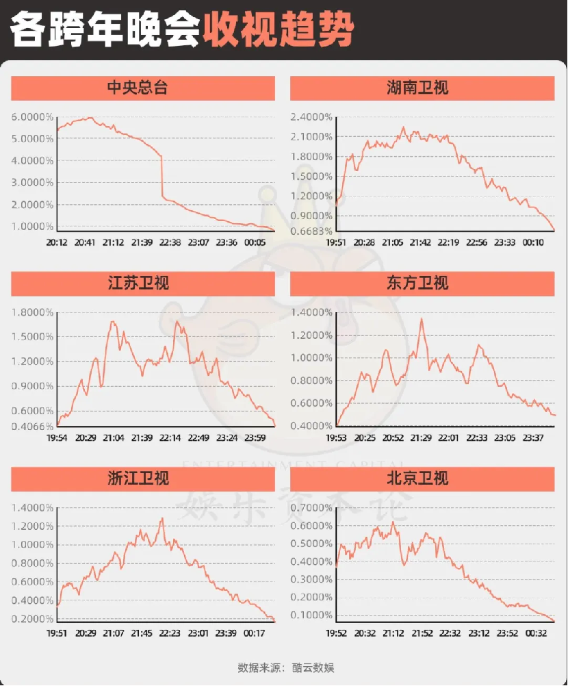 央视跨年晚会凭借庞大观众基础,开播即破5%收视率,孙楠表演和诵读节目带来小高峰,但后段收视下降至1.1187%,低于湖南卫视的1.1540%。
